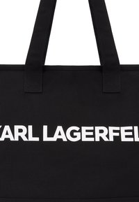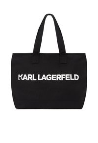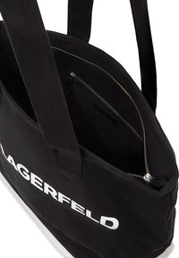 Γυναίκα που φοράει μπεζ κοντή ζακέτα και παντελόνι με φαρδιά πόδια, κρατώντας μεγάλη μαύρη τσάντα tote με το λευκό λογότυπο "KARL LAGERFELD" σε απλό φόντο.