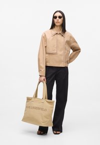 Γυναίκα που φοράει μπεζ σακάκι και γυαλιά ηλίου, μαύρο παντελόνι, κρατώντας μπεζ τσάντα tote Karl Lagerfeld με σανδάλια ανοιχτού τύπου σε λευκό φόντο.