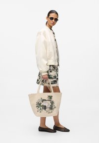 Γυναίκα που φοράει κρεμ μπουφάν μπότερμα και φλοράλ φόρεμα, κρατώντας μπεζ τσάντα ώμου με εικονογράφηση τροπικού τοπίου και μαύρες πλεκτές εσπαντρίγιες.