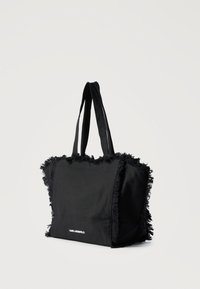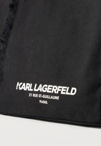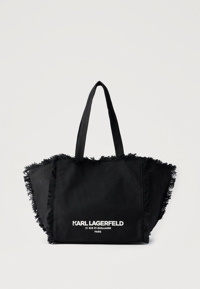 Μαύρη τσάντα tote από ύφασμα με κρόσσια στις άκρες και λευκό κείμενο "KARL LAGERFELD 21 RUE ST-GUILLAUME PARIS" στην μπροστινή τσέπη.