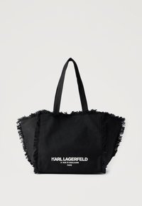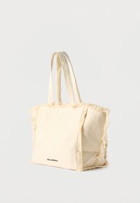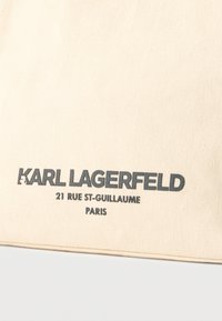 Μπεζ τσάντα ώμου από καμβά με διακοσμητικές φούντες, δύο χερούλια και μαύρο λογότυπο "Karl Lagerfeld 21 Rue St-Guillaume Paris" στο κέντρο μπροστά.