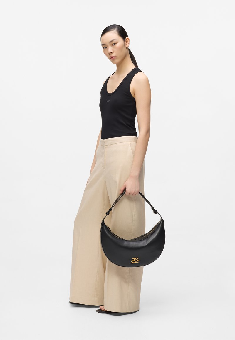 Γυναίκα που φοράει μαύρο τοπ χωρίς μανίκια και μπεζ παντελόνι φαρδιάς γραμμής, κρατώντας μια μαύρη τσάντα σε σχήμα ημισελήνου με χρυσό λογότυπο, στέκεται σε απλό φόντο.
