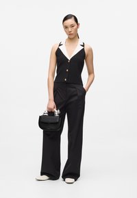Γυναίκα που φοράει μαύρο αμάνικο γιλέκο με λευκό γιακά, μαύρο παντελόνι φαρδιάς γραμμής, λευκά παπούτσια, κρατώντας μαύρη τσάντα χειρός με ασημένιες λαβές.