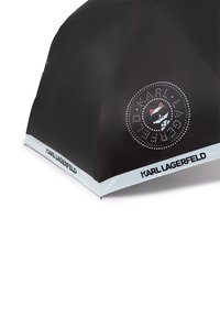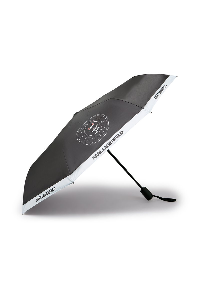 Μαύρη ομπρέλα που διπλώνει με λευκό περίγραμμα και το κείμενο "Karl Lagerfeld", με ένα κυκλικό λογότυπο που παρουσιάζει μια στυλιζαρισμένη γάτα στο κέντρο.