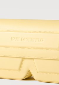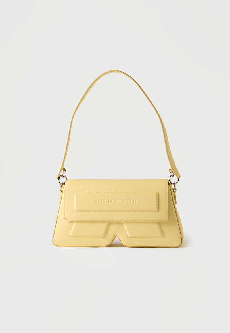 Κίτρινη δερμάτινη τσάντα ώμου με ορθογώνιο καπάκι και ανάγλυφο λογότυπο «KARL LAGERFELD», με μονή λαβή και ασημένια μεταλλικά στοιχεία.