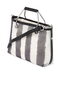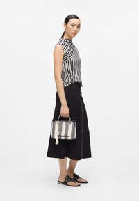 Γυναίκα που φοράει τοπ χωρίς μανίκια με ασπρόμαυρες ρίγες, μαύρη μίντι φούστα με φερμουάρ μπροστά, μαύρα σανδάλια, κρατώντας μια τσάντα με ασπρόμαυρες ρίγες.
