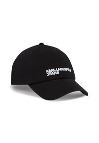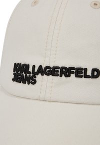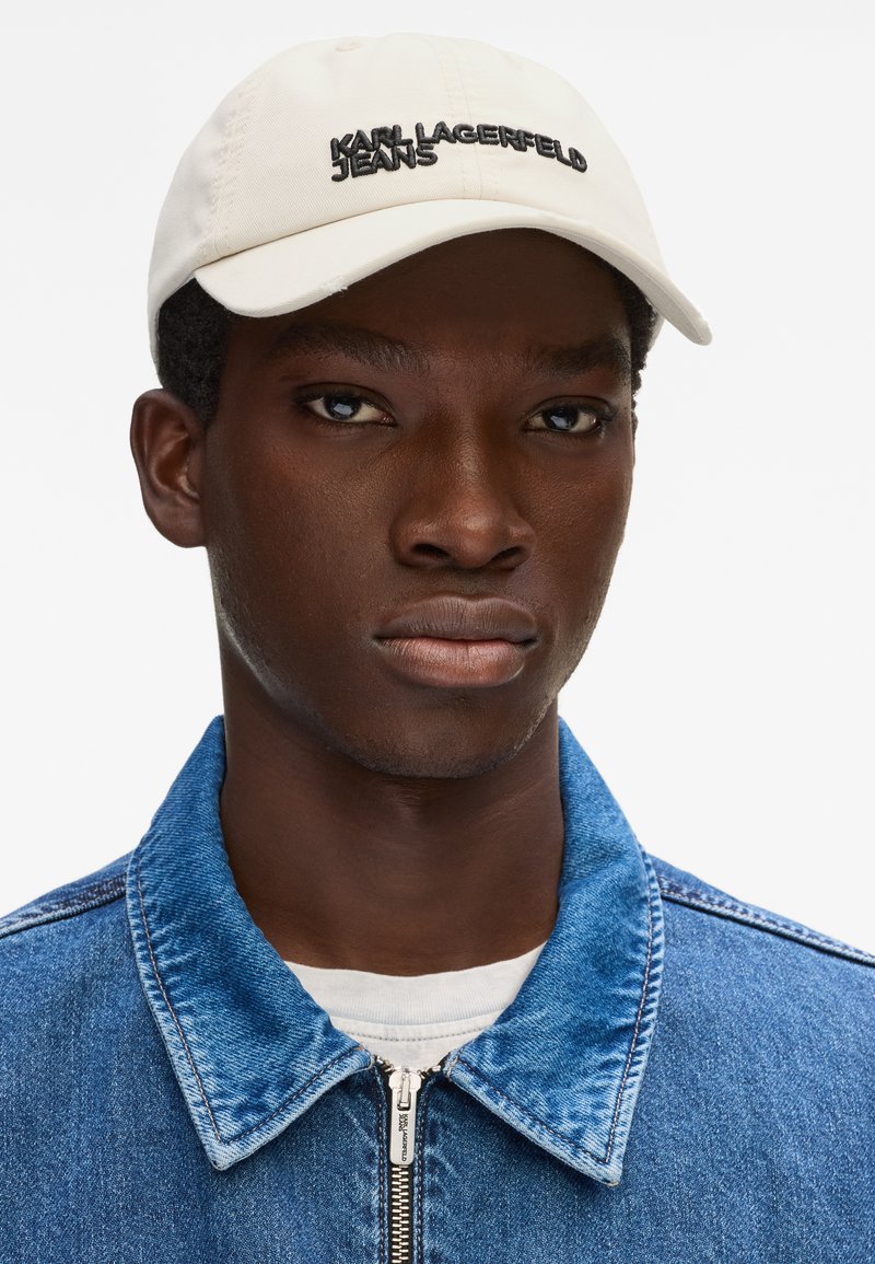Νέος άνδρας που φοράει ένα λευκό καπέλο με το κείμενο "KARL LAGERFELD JEANS" και ένα μπλε τζιν μπουφάν με φερμουάρ πάνω από λευκό πουκάμισο.
