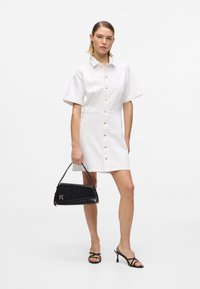 Νεαρή γυναίκα που φοράει λευκό φόρεμα με κοντά μανίκια και κουμπιά, κρατώντας μια μαύρη τσάντα και φοράει μαύρα σανδάλια με τακούνι και λουράκια.