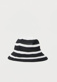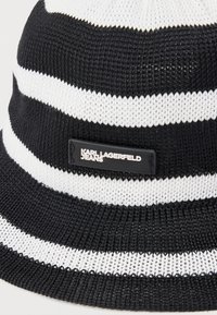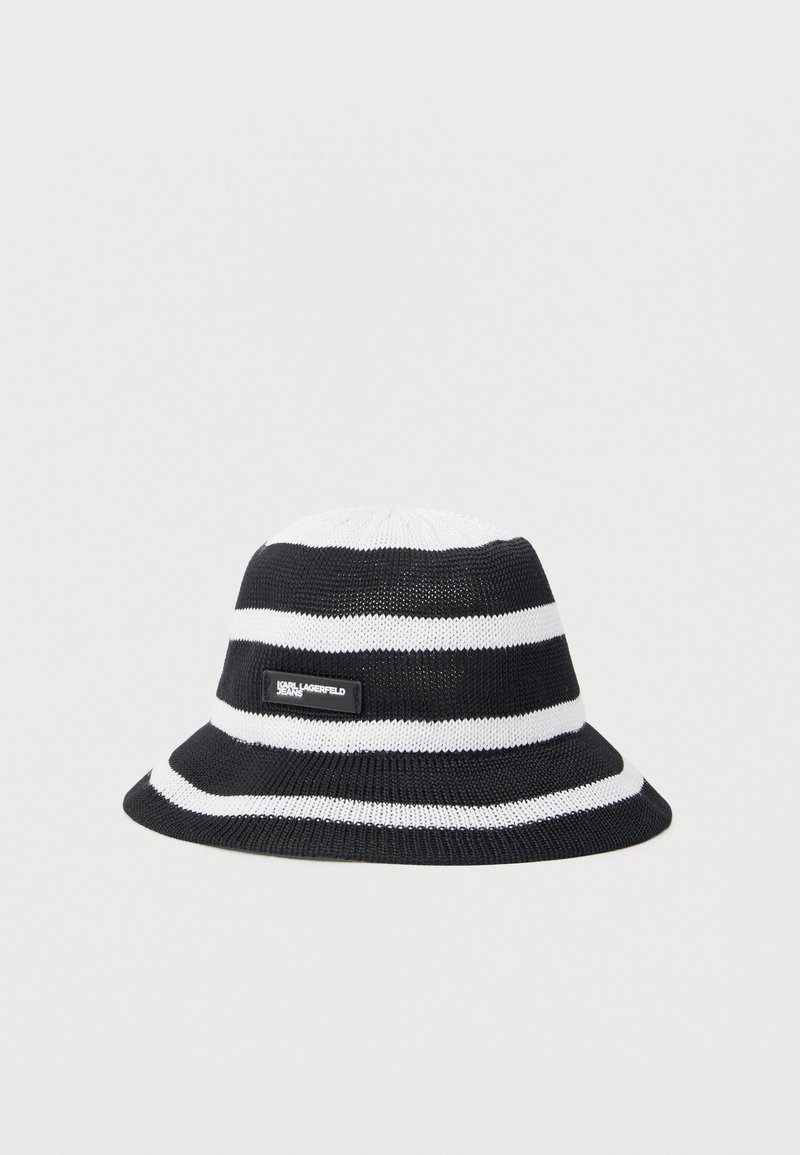 Πλεκτό καπέλο τύπου bucket με ασπρόμαυρες ρίγες και μια μικρή ετικέτα «Karl Lagerfeld Jeans» στο πλάι.