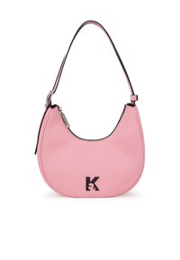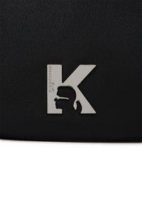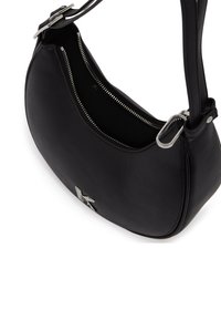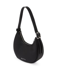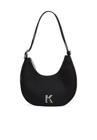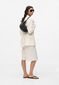 Γυναίκα με λευκό σακάκι και σορτς, φοράει μεγάλα γυαλιά ηλίου και μαύρη τσάντα ώμου σε σχήμα ημισελήνου με λογότυπο, στέκεται σε πλάγια όψη.