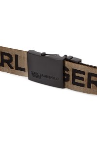 Μαύρη υφασμάτινη ζώνη με μπεζ μεγάλα γράμματα και μαύρη ορθογώνια πόρπη με χαραγμένο το "Karl Lagerfeld Jeans."