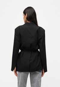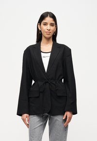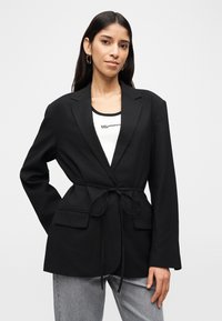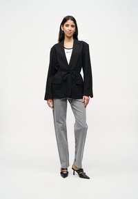 Γυναίκα που φοράει μαύρο σακάκι με ζώνη, λευκό τοπ με κείμενο, ανοιχτόγκρι τζιν και χρυσούς κρίκους σκουλαρίκια σε λευκό φόντο.