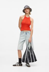 Νεαρό άτομο που φοράει κόκκινο τοπ με μπαλκονέ, ελαφριά τζιν σορτς, μαύρα και λευκά αθλητικά παπούτσια με μαύρες κάλτσες, καπέλο κάδο με ρίγες και κρατάει μια μεγάλη μαύρη και λευκή τσάντα χειρός.