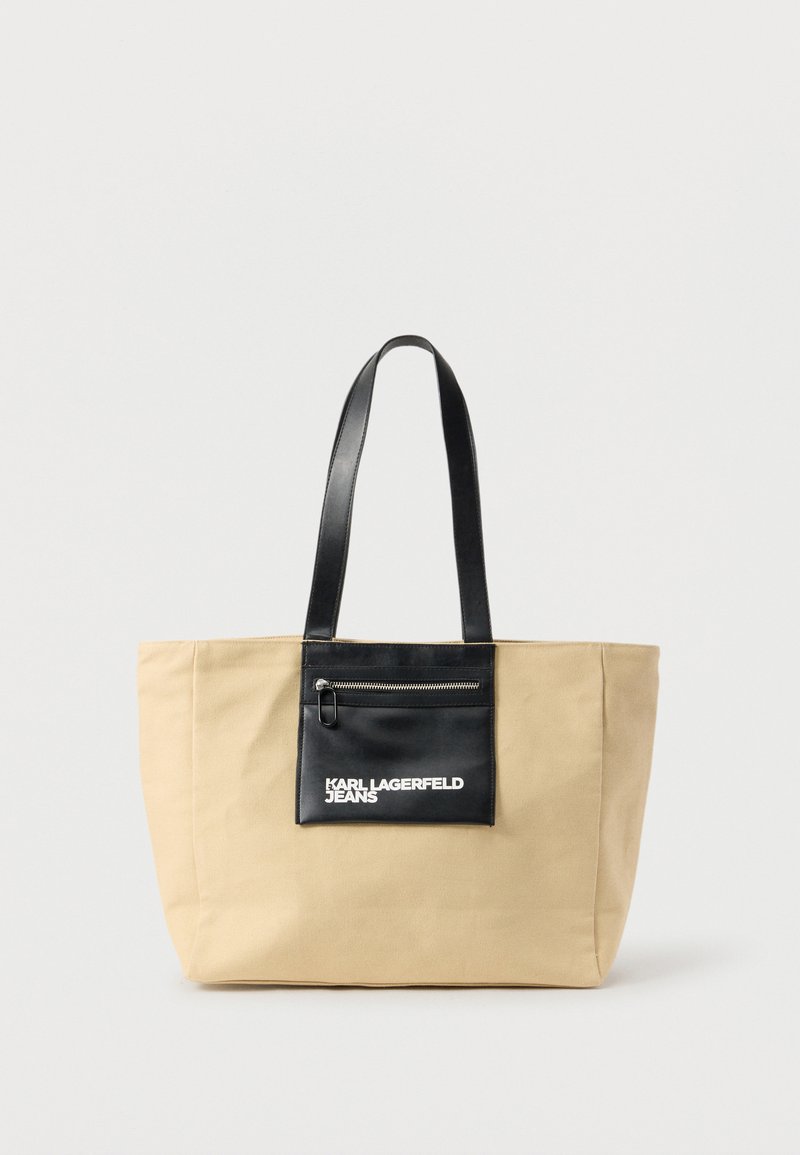 Μπεζ υφασμάτινη τσάντα ώμου με μαύρες δερμάτινες λαβές και μπροστινή τσέπη με φερμουάρ, με την επιγραφή «Karl Lagerfeld Jeans» σε λευκό φόντο.