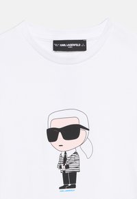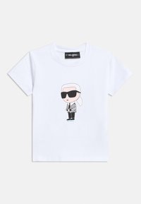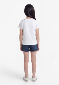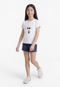 Κορίτσι που χαμογελά, φοράει λευκό γραφικό t-shirt, σκούρα τζιν σορτς και λευκά αθλητικά παπούτσια, περπατώντας με το ένα πόδι μπροστά σε απλό λευκό φόντο.