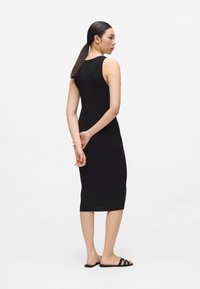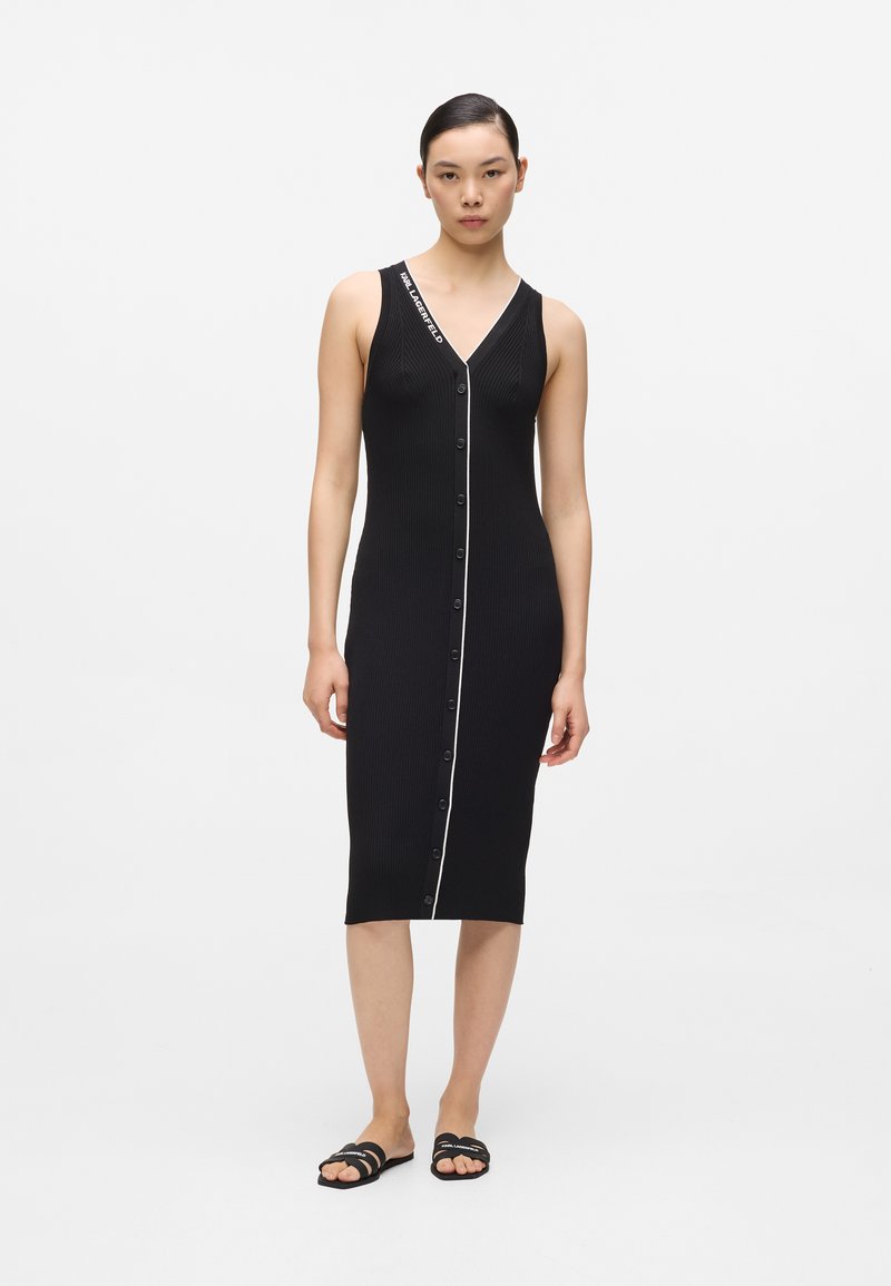 Γυναίκα που φοράει μαύρο ριμπ midi φόρεμα χωρίς μανίκια με κουμπιά εμπρός και άσπρη επένδυση, συνδυασμένο με μαύρα σανδάλια slide.
