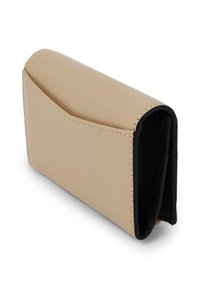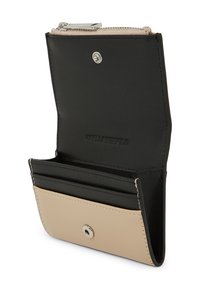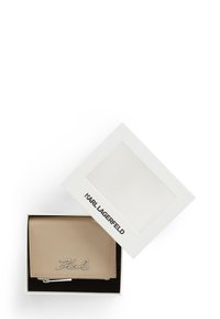 Μπεζ δερμάτινο πορτοφόλι με ασημί λογότυπο "Karl" στο μπροστινό μέρος και ορατό ασημί φερμουάρ στο κάτω άκρο.
