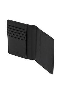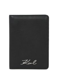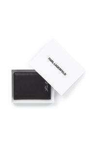 Μαύρο δίπτυχο δερμάτινο πορτοφόλι με λείο υφή και ασημένια υπογραφή "Karl" στην κάτω δεξιά γωνία της μπροστινής πλευράς.