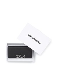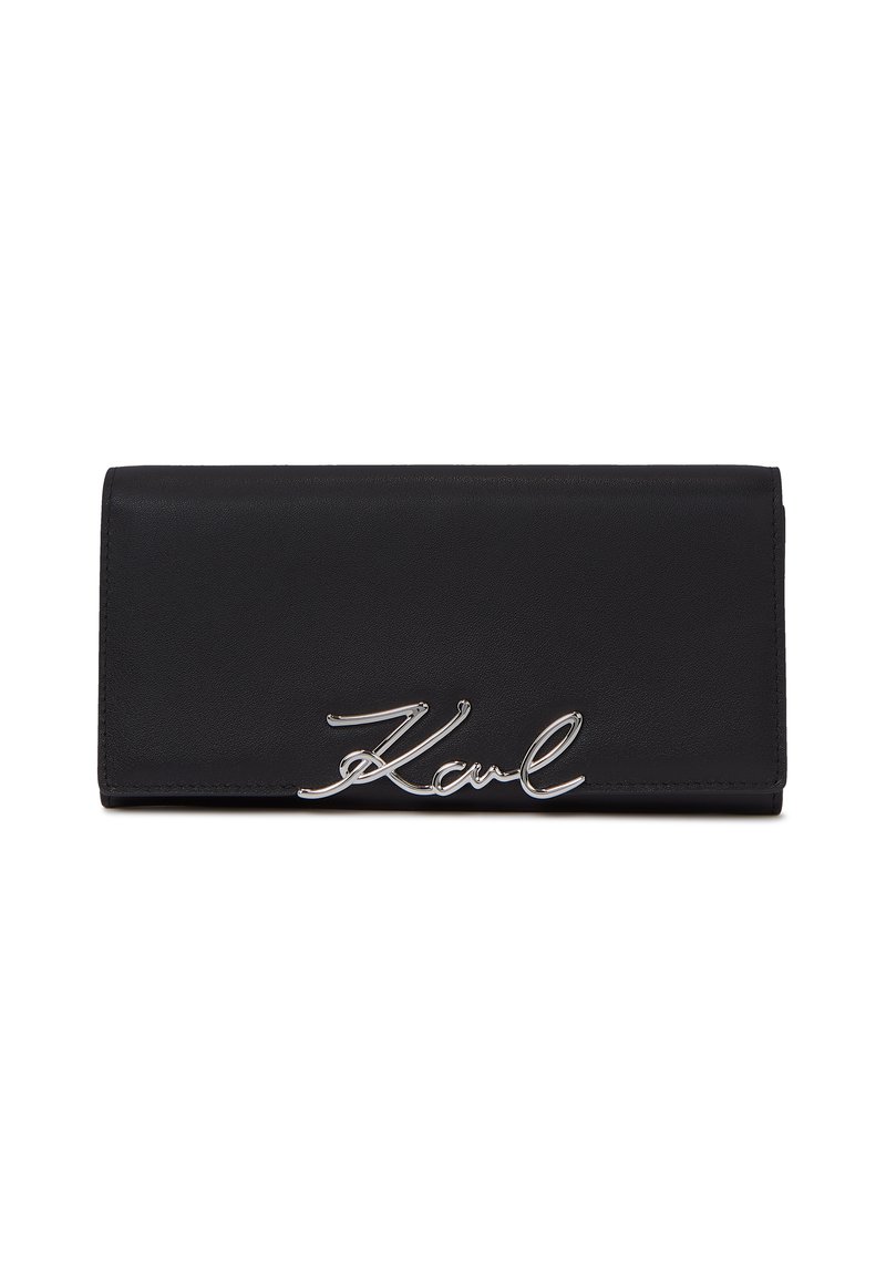 Μαύρο ορθογώνιο πορτοφόλι με ασημένιο λογότυπο "Karl" σε στυλ γραφής στην μπροστινή πλευρά, λεία υφή, διπλωτό σχέδιο, χωρίς ορατά κλειστά.