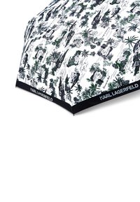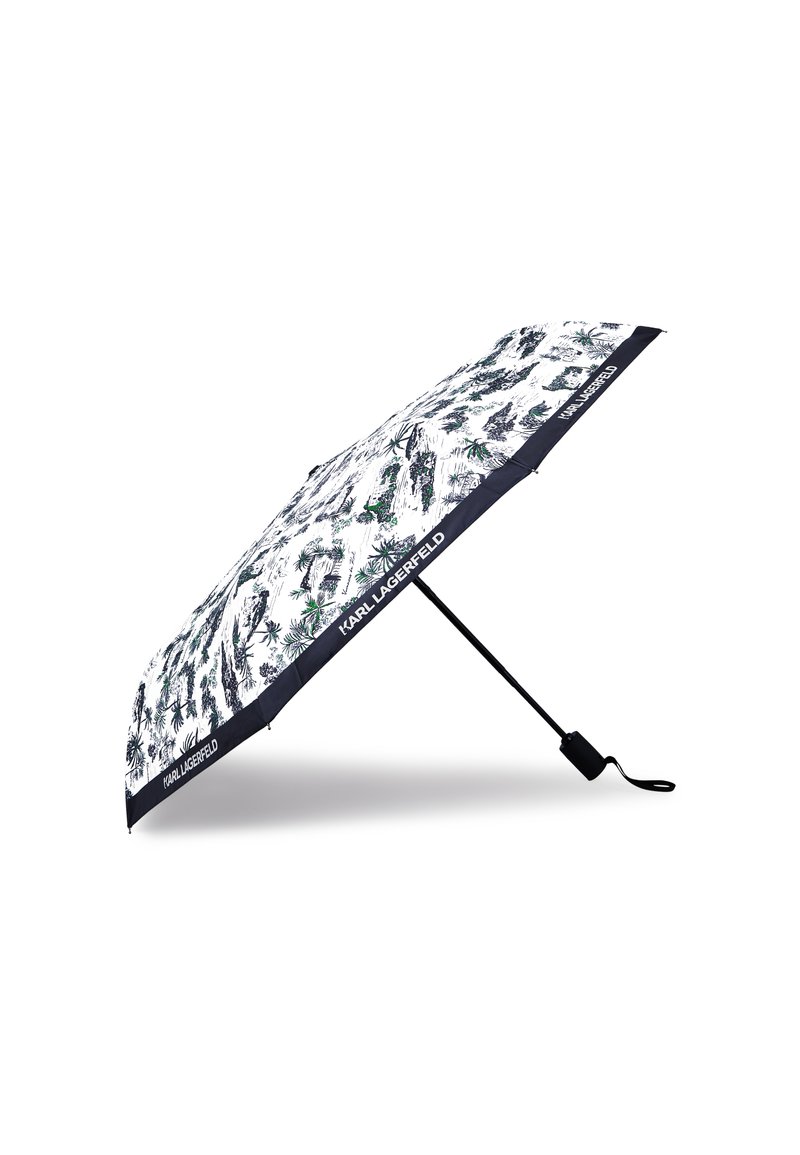 Συμπαγές μαύρο ομπρέλα με λευκή επικάλυψη που διαθέτει φυτικό και αρχιτεκτονικό σχέδιο, με την επωνυμία «KARL LAGERFELD» στην άκρη.