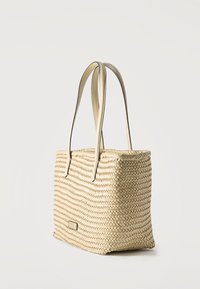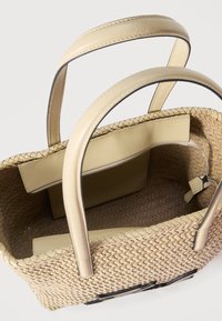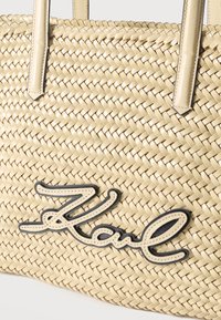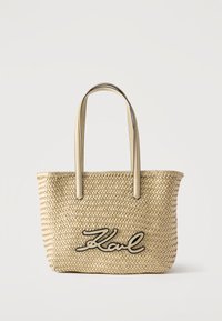 Υφαντή τσάντα από ψάθα με μπεζ δερμάτινες χειρολαβές και λογότυπο «Karl» σε καλλιγραφικό στυλ με μαύρο περίγραμμα στο μπροστινό μέρος, σε απλό λευκό φόντο.