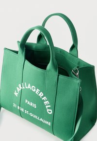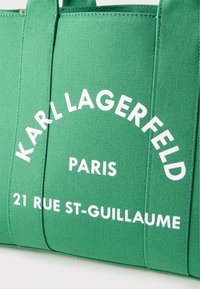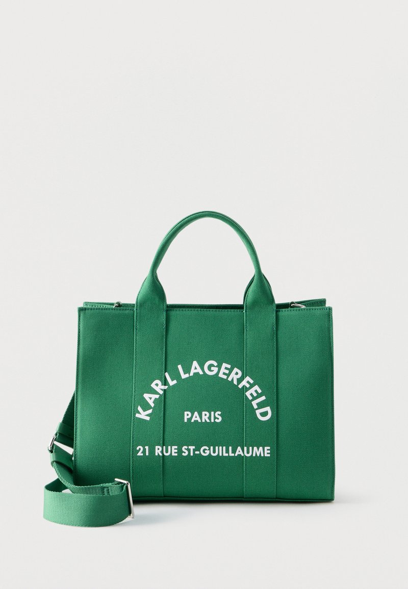 Πράσινη ορθογώνια τσάντα tote με δύο χερούλια και ρυθμιζόμενο λουρί ώμου, με λευκή επιγραφή «KARL LAGERFELD PARIS 21 RUE ST-GUILLAUME».