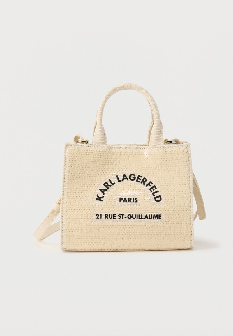 Μπεζ υφαντή τσάντα χειρός με κοντά χερούλια, ρυθμιζόμενο λουρί και την επιγραφή «Karl Lagerfeld Paris 21 Rue St-Guillaume» τυπωμένη μαύρη στο μπροστινό μέρος.