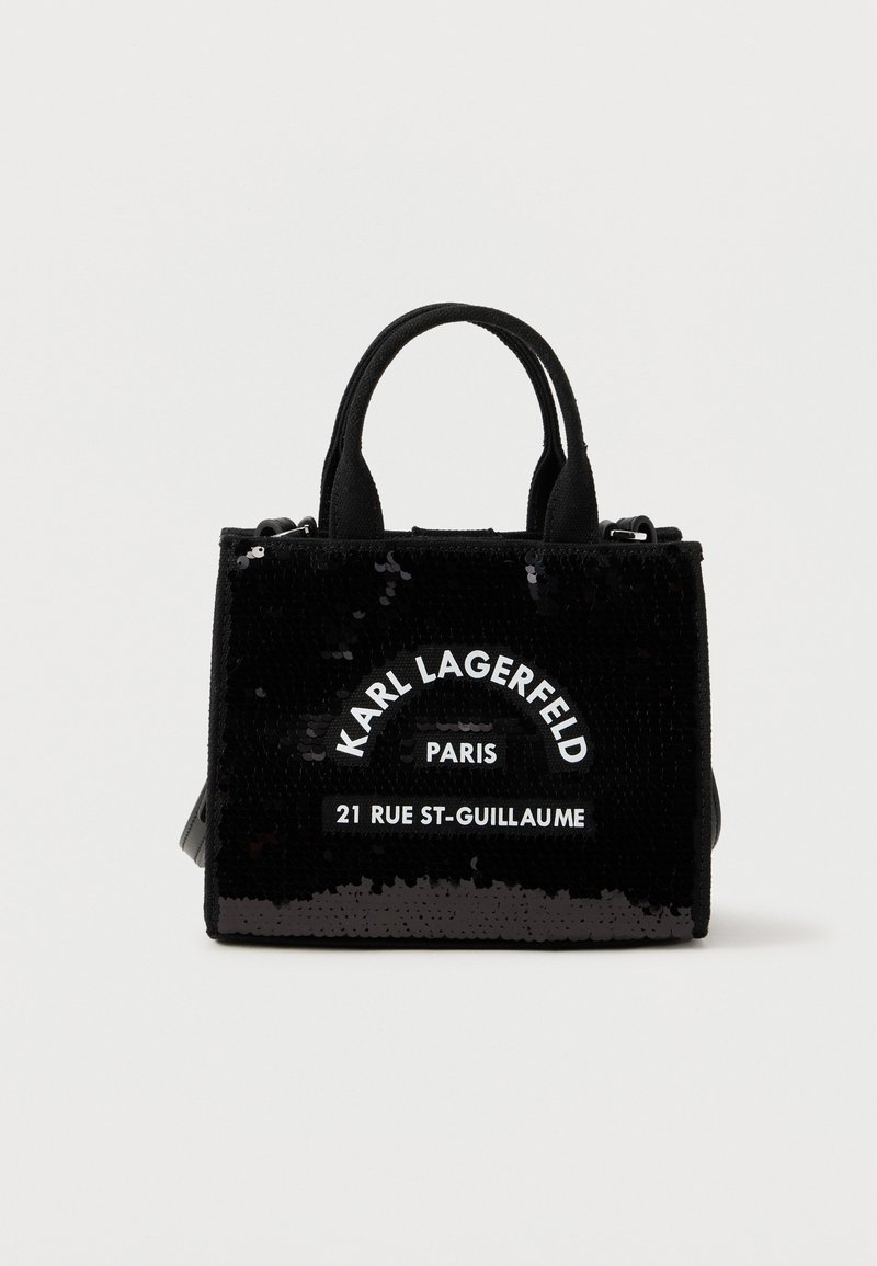 Μαύρη γυναικεία τσάντα με δύο λαβές, καλυμμένη με παγιέτες, με λευκή επιγραφή "Karl Lagerfeld Paris 21 Rue St-Guillaume" στο μπροστινό μέρος.