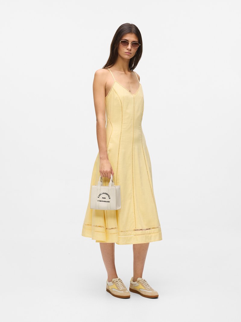 Γυναίκα που φοράει κίτρινο φόρεμα μίντι και μπεζ αθλητικά παπούτσια, κρατώντας μια μικρή λευκή τσάντα, με γυαλιά ηλίου και ίσια μαλλιά.