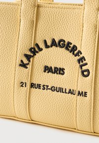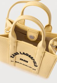 Μικρή κίτρινη υφασμάτινη τσάντα με δύο χερούλια, αφαιρούμενο λουρί και μαύρο κείμενο "Karl Lagerfeld Paris 21 Rue St-Guillaume" στο μπροστινό μέρος.