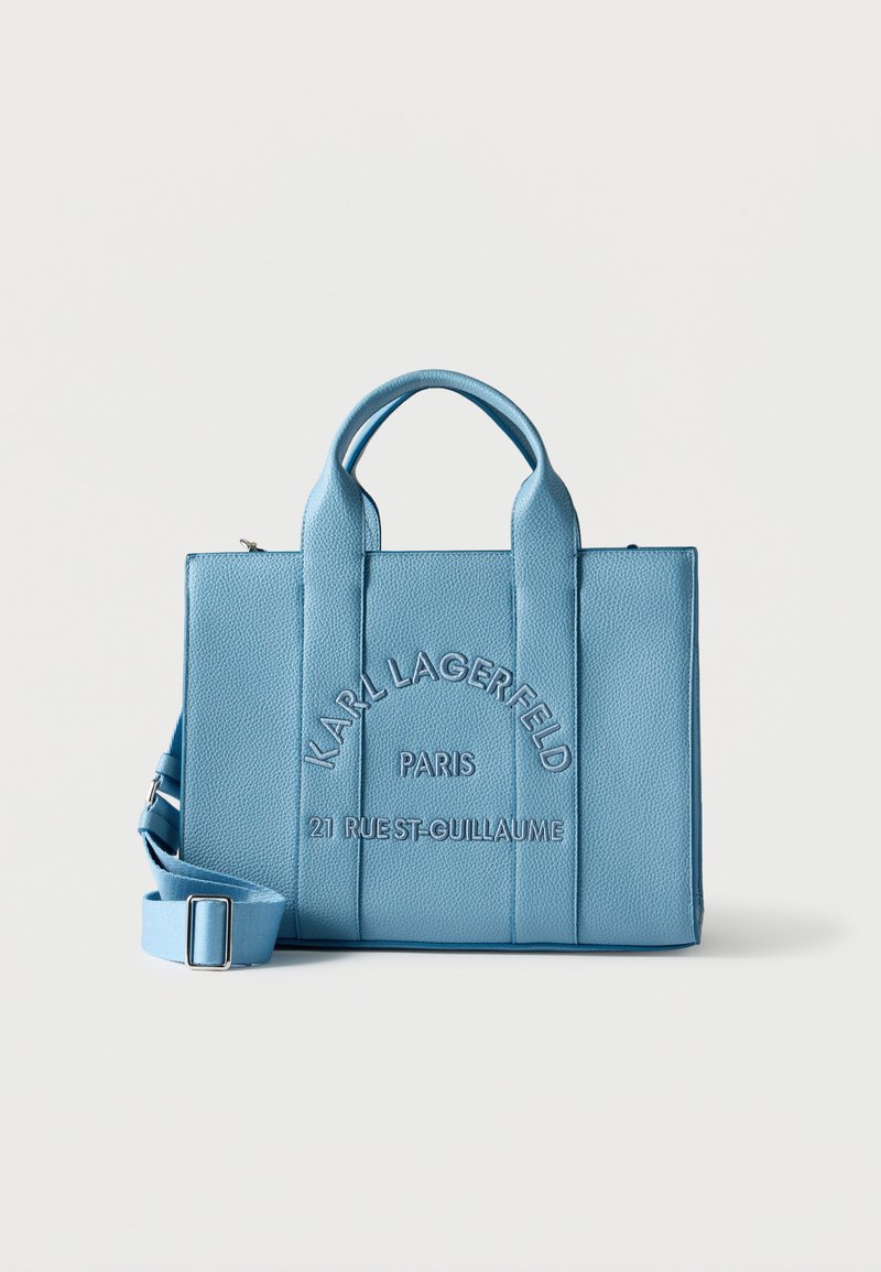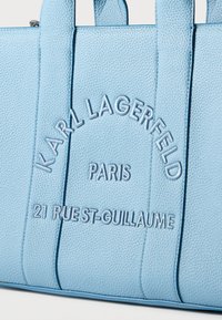 Τσάντα tote από δέρμα με ανάγλυφη υφή σε ανοιχτό γαλάζιο χρώμα, με διπλές λαβές και ρυθμιζόμενο ιμάντα ώμου, με ανάγλυφο κείμενο "Karl Lagerfeld Paris" και διεύθυνση.