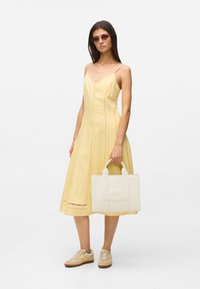 Γυναίκα που φοράει κίτρινο αμάνικο φόρεμα μήκους μέχρι τη μέση, μπεζ αθλητικά παπούτσια, γυαλιά ηλίου, και κρατάει μια λευκή ορθογώνια τσάντα tote με ανάγλυφο κείμενο.
