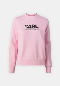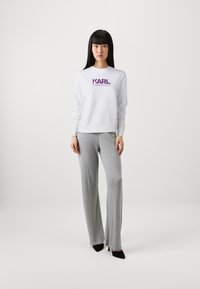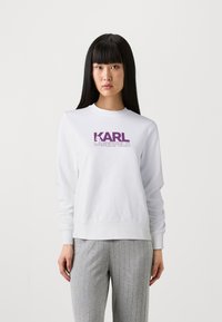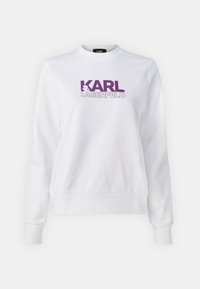 Λευκή μπλούζα φανέλας από μίγμα βαμβακιού, με έντονο μωβ λογότυπο "KARL LAGERFELD" στο στήθος, ριμπ μανσέτες και στρίφωμα.
