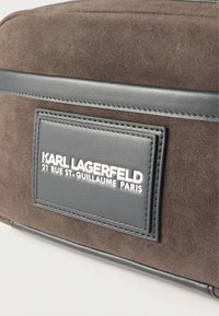 Καφέ σουέντ ορθογώνιο πουγκί με μαύρο δερμάτινο περίγραμμα και φερμουάρ, με μαύρη ετικέτα που γράφει "Karl Lagerfeld 21 Rue St-Guillaume Παρίσι".