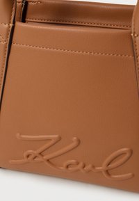 Καφέ δερμάτινη τσάντα χειρός με δύο επάνω χερούλια, ρυθμιζόμενο ιμάντα ώμου και ανάγλυφη υπογραφή "Karl" στο μπροστινό πάνελ.