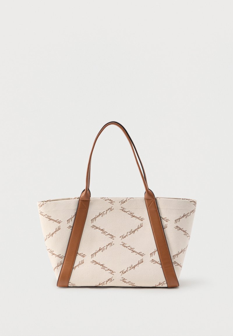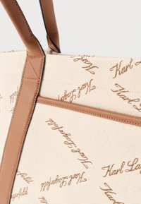 Μπεζ τσάντα tote από καμβά με επαναλαμβανόμενο καφέ κείμενο "Karl Lagerfeld" και καφέ δερμάτινα χερούλια και διακοσμητικά.