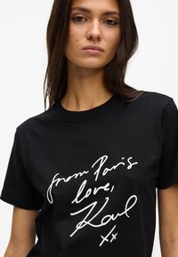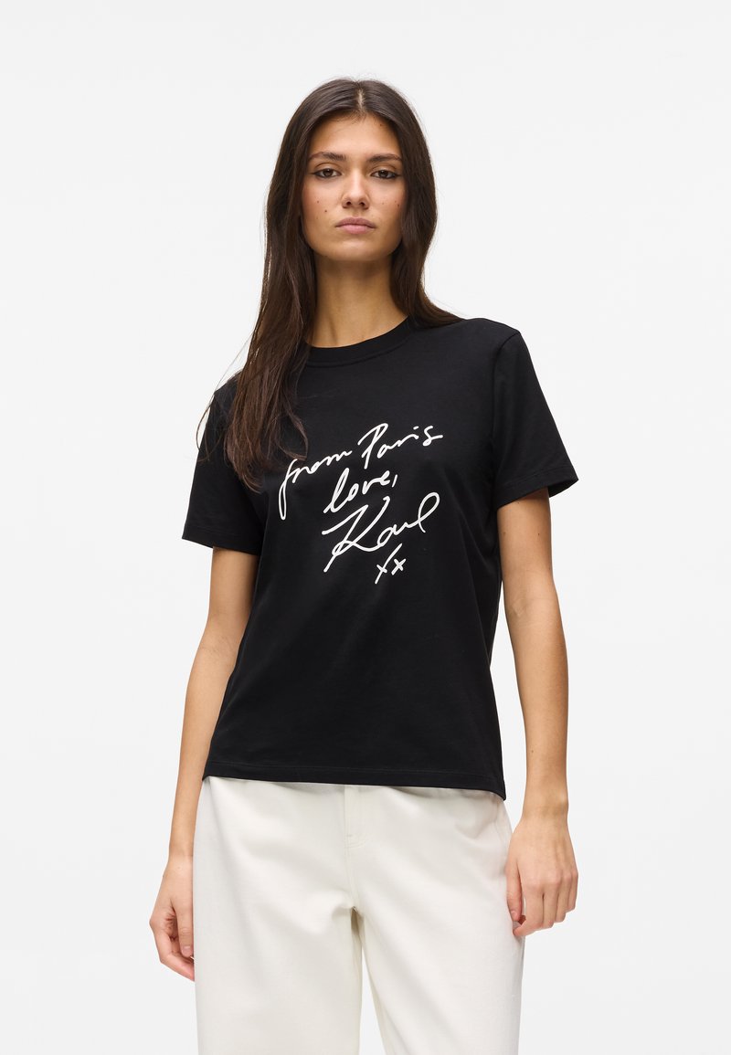 Νεαρή γυναίκα με μακριά σκούρα μαλλιά, φορεί μαύρο T-shirt με λευκό καλλιγραφικό κείμενο «from Paris love, Karl xx» και λευκό παντελόνι, στέκεται μπροστά σε λευκό φόντο.