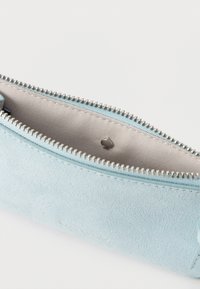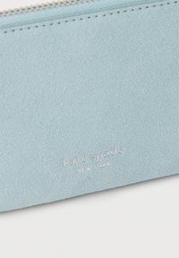 Φακελάκι χειρός από ανοιχτό μπλε σουέτ με φερμουάρ, λουράκι καρπού με φιόγκο και το λογότυπο "kate spade new york" μπροστά.