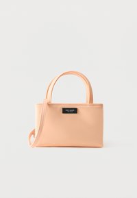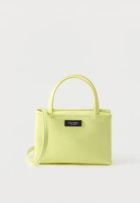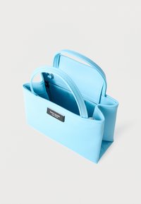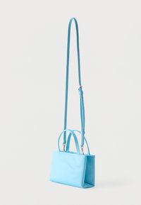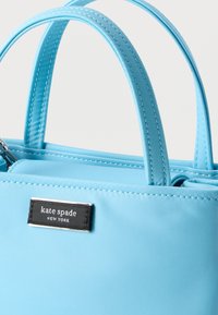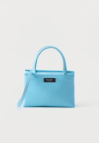Μικρό γαλάζιο τσαντάκι Kate Spade με διπλές λαβές και αποσπώμενο λουρί ώμου σε λευκό φόντο.