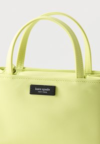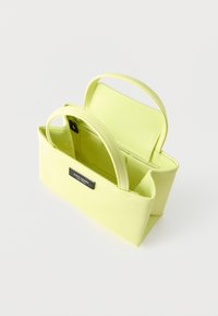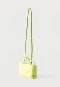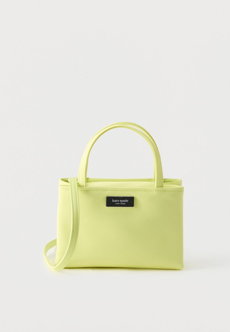 Μικρό ορθογώνιο τσάντα χειρός ανοιχτού πράσινου χρώματος με δύο λαβές και αποσπώμενο ιμάντα ώμου σε απλό φόντο.