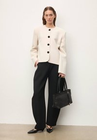 Κρεμ structured σακάκι με μαύρα κουμπιά, σε συνδυασμό με πλεκτή μαύρη τσάντα χειρός με δερμάτινες λαβές και φερμουάρ