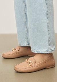 Μπεζ δερμάτινα loafers με επίπεδη σόλα, χρυσές μεταλλικές λεπτομέρειες στο επάνω μέρος και ορατή ραφή· φορεμένα με ανοιχτόχρωμα μπλε τζιν.