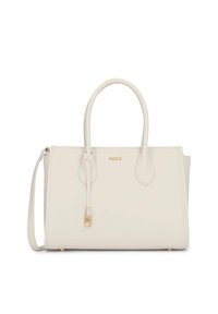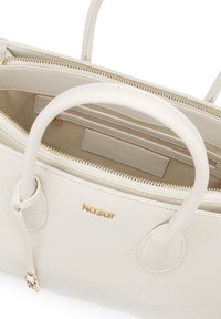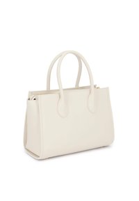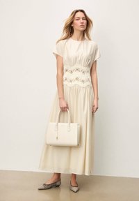 Γυναίκα που φοράει ένα ανοιχτό μπεζ φόρεμα κρατά μια μεγάλη κρεμ τσάντα με διπλή λαβή και έναν ιμάντα ώμου στον ώμο της.