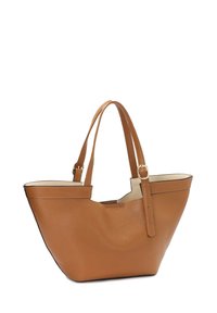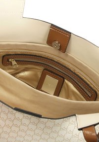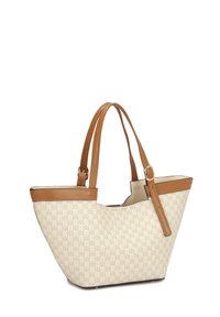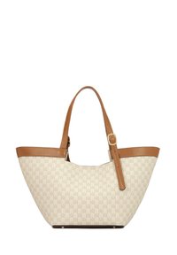 Τσάντα tote από κρέμα συνθετικό υλικό με καφέ δερμάτινες λεπτομέρειες. Διαθέτει διακριτό μοτίβο λογότυπου, διπλές λαβές και στρογγυλή βάση.