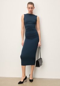 Πόδια που φορούν μαύρες ψηλοτάκουνες γόβες peep-toe με λεπτά τακούνια στιλέτο πάνω σε λεία επιφάνεια, συνδυασμένες με μπλε φούστα.