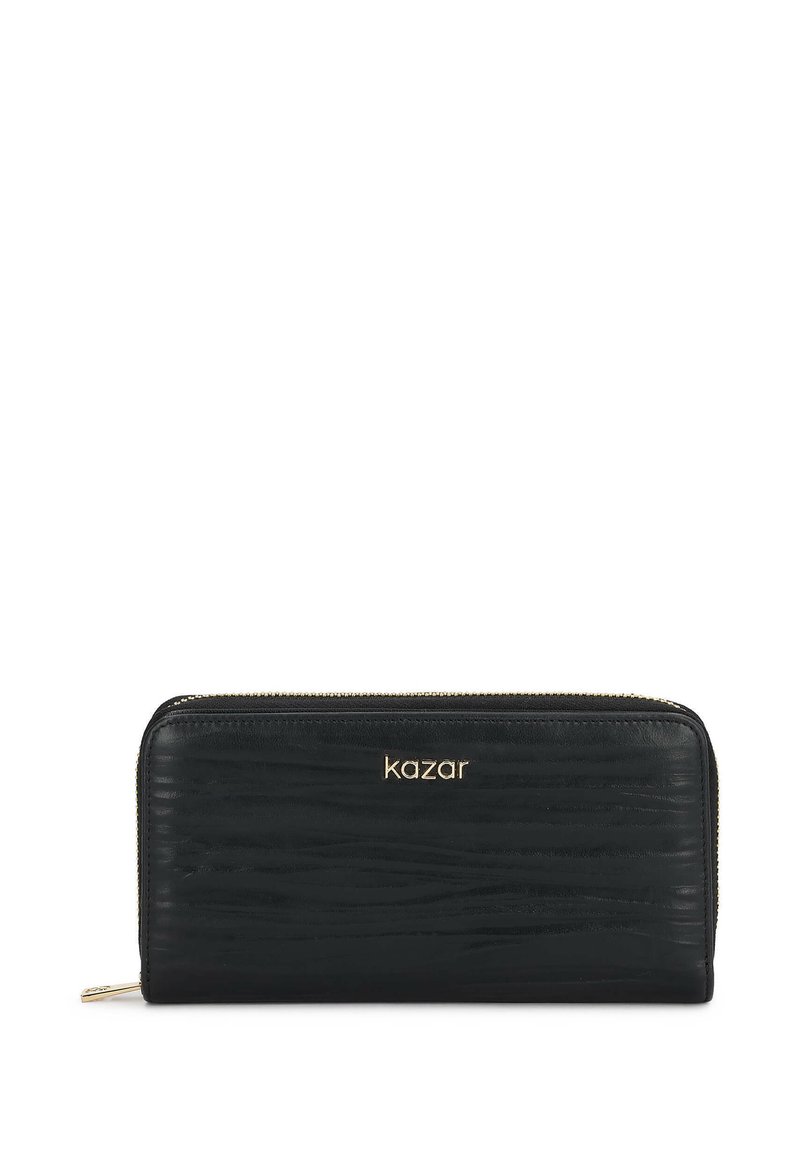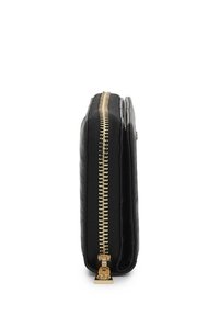 Μαύρο δερμάτινο πορτοφόλι με υφή. Διαθέτει χρυσαφί φερμουάρ και ανάγλυφο λογότυπο μπροστά. Λεπτή ορθογώνια μορφή.
