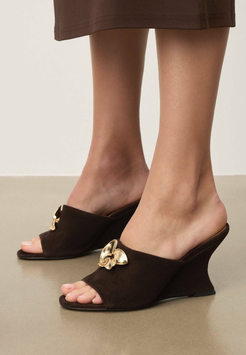 Καφέ σουέντ πλατφόρμες με ανοιχτό σχέδιο στο δάχτυλο, με χρυσή μεταλλική λεπτομέρεια μπροστά και καμπυλωτή φιάπα τακουνιού.
