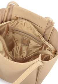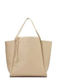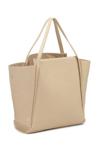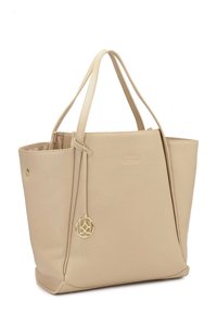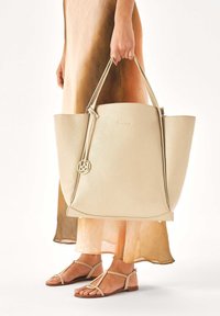 Κρέμα δερμάτινη τσάντα tote με υφή, διαθέτοντας ένα διακριτικό στρογγυλό λογότυπο και χρυσές λεπτομέρειες στη βάση.