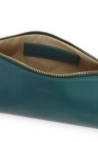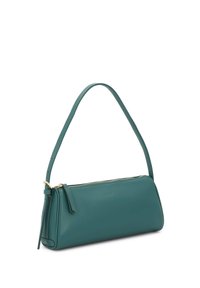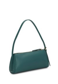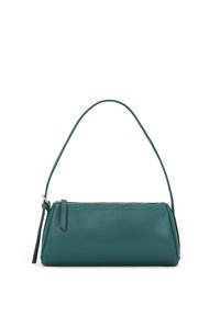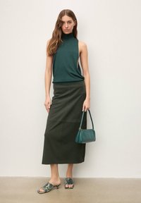 Πράσινο αμάνικο τοπάκι με ζιβάγκο συνδυασμένο με σκουροπράσινη φούστα. Το μοντέλο κρατάει μια τσάντα χειρός σε ταιριαστό πράσινο με δομημένο σχέδιο. Ομαλή υφή, μινιμαλιστικός σχεδιασμός.