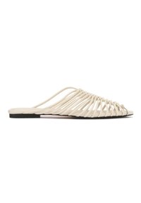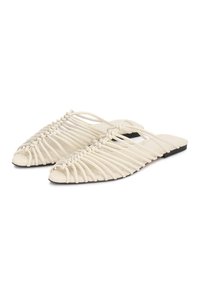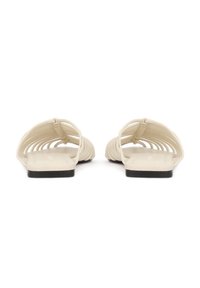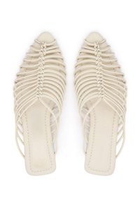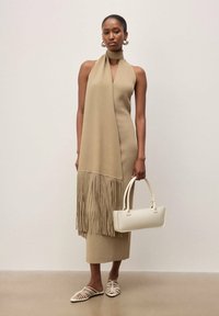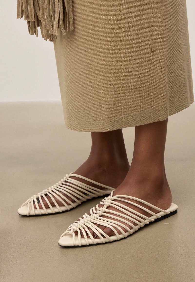 Πόδια με μπεζ σανδάλια με λουριά, συνδυασμένα με μπεζ φούστα που έχει λεπτομέρειες με φούντες στο τελείωμα.